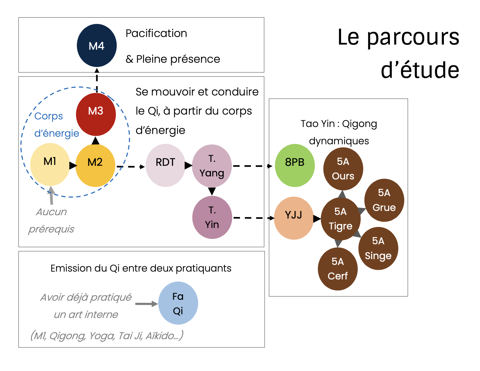 ( M1, M2, M3, M4 : modules du Chong Yuan Qigong. RDT : Rotation Dan Tian. T.Yang : Transfert Yang. T.Yin : Transfert yin. 8PB : 8 Pièces de Brocart. YJJ : Yi Jin Jing. 5A. : Qigong des 5 animaux )